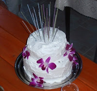 Potrebovala som urobiť tortu pre minimalne 20 ľudí pre Peťka na jeho narodeninovo-meninovo-promóciovú oslavu. Chcela som niečo viacposchodové, pretože som takú tortu ešte nerobila a túžila som také niečo vyskúšať. Rozhodla som sa vyskúšať recept z májového Apetitu 2006 na svadobnú čokoládovú tortu, akurát že som urobila len horné dve poschodia. Ja som moju tortu nepokryla poťahom z bielej čokolády, pretože sa mi poťahovacia hmota absolútne nepodarila a letela do koša. Tak som celú tortu len potrela šľahačkou. A namiesto čerstvého ovocia som použila na zdobenie jedlé orchidey. Bola krásna, elegantná a čo bolo najlepšie, aj úžasne chutila. Prisahám, lepšiu čokoládovú tortu som vživote nejedla! Korpusy sú z cesta podobnému brownies, proste niet čo dodať. Takto vyzeral originál: